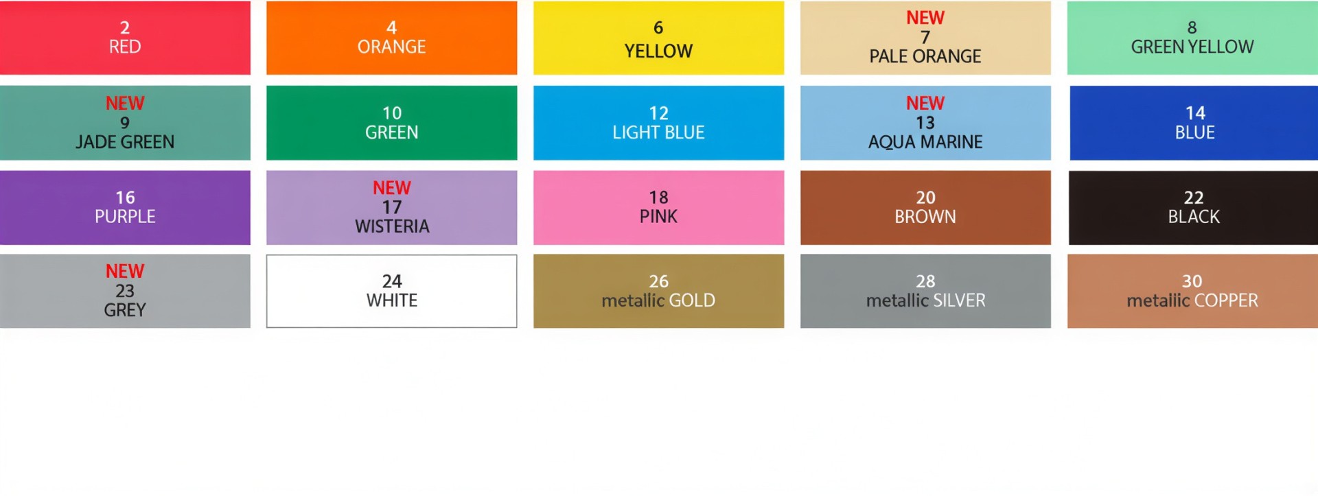 Red, Orange, Yellow, Green Yellow, Green, Light Blue, Blue, Purple, Pink, Brown, Black, White, Gold, Silver, Copper, Pale Orange, Jade Green, Aqua Marine, Wisteria, Grey