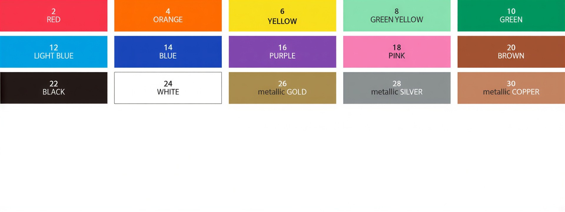 Red, Orange, Yellow, Green Yellow, Green, Light Blue, Blue, Purple, Pink, Brown, Black, White, Gold, Silver, Copper