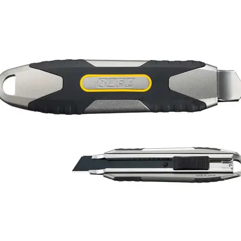 OLFA MXP-AL - 18mm-es standard kés / sniccer. Minden elképzelhető luxus egy késben. Kivételesen erős öntött alumínium test. Az X design markolat, egy csúszásmentes elasztomer betét és egy erős polipropilén műanyag váz kombinációja. A markolat összeállításánál nem használtak ragasztóanyagot. A törés biztos rozsdamentes és krómozott pengecsatorna, nagy hajlítószilárdságú és kopásálló. A gyors és stabil pengerögzítés érdekében a legfejlettebb automatikus záró pengecsúszkával felszerelve. A markolat végén található nagyméretű lyuk megkönnyíti a kés szerszámfalon való tárolását.