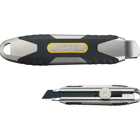 OLFA MXP-L - 18mm-es standard kés / sniccer. Minden elképzelhető luxus egy késben. Kivételesen erős öntött alumínium test. Az X design markolat, egy csúszásmentes elasztomer betét és egy erős polipropilén műanyag váz kombinációja. A markolat összeállításánál nem használtak ragasztóanyagot. A törés biztos rozsdamentes és krómozott pengecsatorna, nagy hajlítószilárdságú és kopásálló. A csavaros pengerögzítő könnyedén működik. Szilárdsága érdekében, egy darabból készült. A markolat végén található nagyméretű lyuk megkönnyíti a kés szerszámfalon való tárolását.