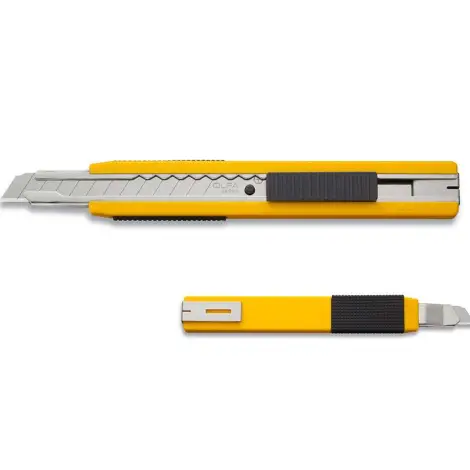 OLFA A-2 - 9mm-es standard kés / sniccer. Általános funkciójú acélházas vágóeszköz, műanyag markolatában gumi betéttel. Fém zsebcsíptetővel és pengetörővel.