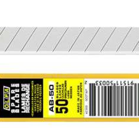 OLFA AB-50 - 9mm-es standard tördelhető penge. A következő standard késekhez alkalmazható: SPC-1, S, 180 Black, ES-1/green, A-1, A-2, A-3, A-5, 300, NA-1, SVR-1, SVR-2, PA-2 és XA-1.