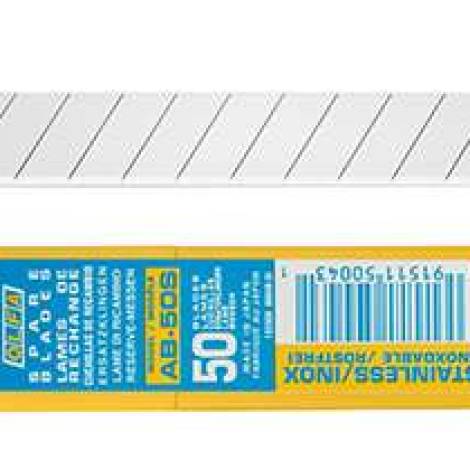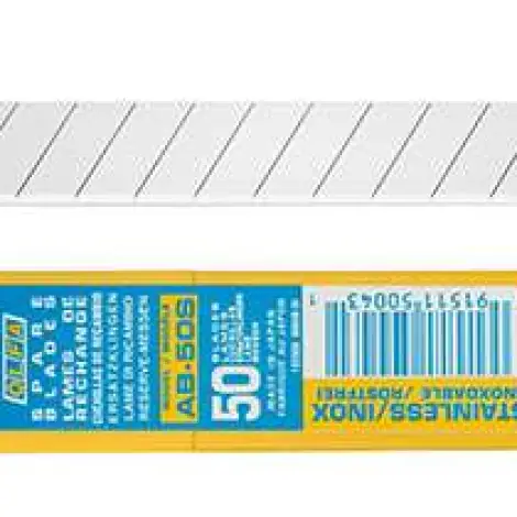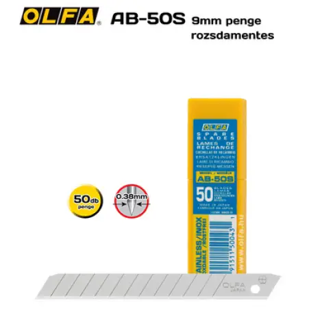 OLFA AB-50S - 9mm-es standard tördelhető rozsdamentes penge. A következő standard késekhez alkalmazható: SPC-1, S, 180 Black, ES-1/green, A-1, A-2, A-3, A-5, 300, NA-1, SVR-1, SVR-2, PA-2 és XA-1.