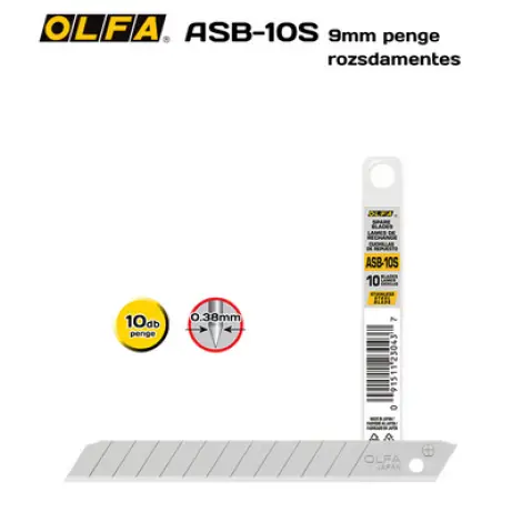 OLFA AB-10S - 9mm-es standard tördelhető rozsdamentes penge. A következő standard késekhez alkalmazható: SPC-1, S, 180 Black, ES-1/green, A-1, A-2, A-3, A-5, 300, NA-1, SVR-1, SVR-2, PA-2 és XA-1.