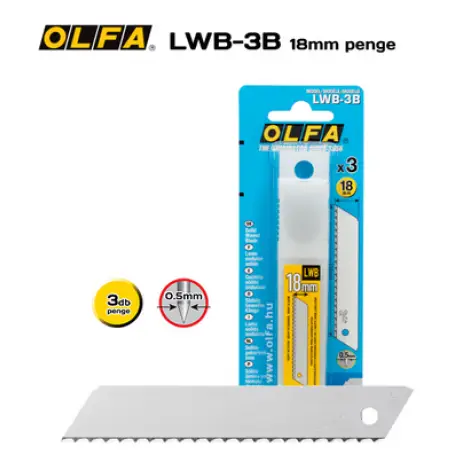 OLFA LWB-3B - Hullámos élszög köszörülésű 18mm-es nem tördelhető penge. A következő standard késekhez alkalmazható: SL-1, BN-L, BN-AL, ML, L-1/green, L-2, XL-2, L-5, L5-AL, L-7, L7-AL, L8-AL, WD-L, WD-AL, MXP-L, MXP-AL, OL, NOL-1, NL-AL és PL-1.