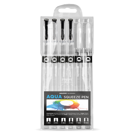 Az üres AQUA Squeeze Pen-nel a színezés nagyon egyszerű. Ez a rafinált eszköz szinte az összes híg tintával vagy vízzel könnyen újratölthető. A tollak ezenfelül gyerekek számára is alkalmasak. A Squeeze-Body összenyomásával a festék áramlása szabályozható és a hegyek valódi ecset módjára viselkednek.