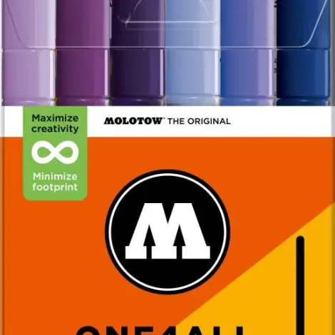 AThe ONE4ALL 2 mm acrylic markers are available in practical 6 pcs. sets. The sets are suitable for beginners and small art projects on paper, canvases or other surfaces. In a total, there are 74 ONE4ALL color shades.