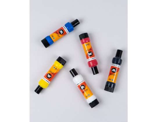 A dripstick tökéletes eszköz a nagy felületekre szinte bármilyen sima felületre. Csavaros fenekének köszönhetően könnyen tölthető – ami a Molotow™ R.E.M.™ (refill-exchange-mix) technológián belül nemcsak a környezet védelmét szolgálja, hanem további lehetőségeket is kínál az egyes árnyalatok keverésére.