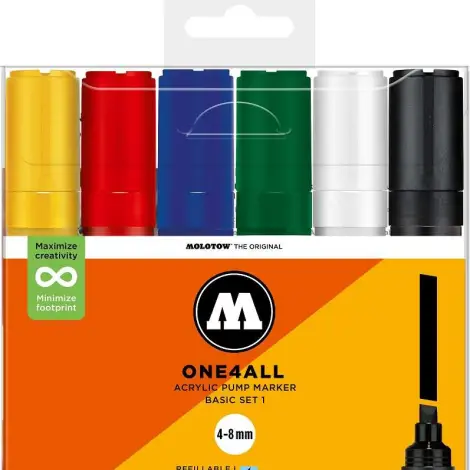 Ez a készlet 6 db ONE4ALL™ 327HS akril markert tartalmaz vágott 4-8 mm-es heggyel. Átlátszó, visszazárható tasakba csomagolva, termékinformációkkal.