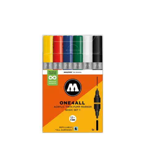 A Molotow ONE4ALL 2024-től 74 színben kapható, újratölthető. Nagy fedőképességgel rendelkezik, tartós és szinte minden felületen UV-álló. Akár szörfdeszkára, vászonra, hűtőre, graffitire vagy tornacipőre festesz: semmi sem lehetetlen. A hatékony színek (fluoreszkáló és fémes) sokkal vonzóbbá teszik a színezést. Nem hiányozhatnak egyetlen művész felszereléséből sem!