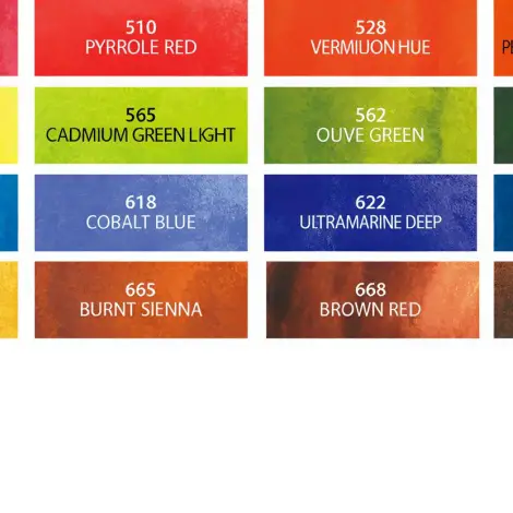Lemon Yellow, Yellow Ochre, Permanent Yellow Deep, Permanent Yellow Orange, Vermilion Hue, Permanent Red, Crimson Lake, Opera, Burnt Sienna, Burnt Umber, Brown Red, Vandyke Brown, Permanent Green, Sap Grren, Olive Green, Viridian Hue, Peacock Blue, Cerulean Blue, Hue, Prussian Blue, Cobalt Blue Hue, Ultramarine Deep, Permanent Violet, Ivory Black, Chinese White