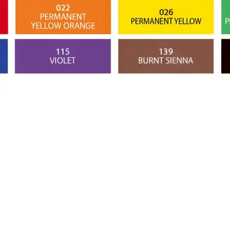 004 Carmine, 008 Scarlet Red, 022 Permanenet Yellow Orange, 026 Permanent Yellow, 049 Permanent Green Light, 064 Viridian,