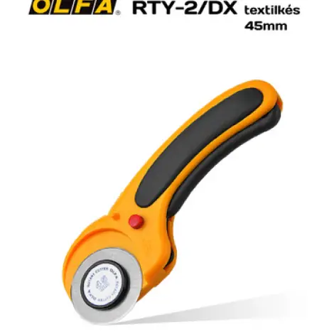 OLFA RTY-2/DX - Deluxe Textilkés. 45 mm-es körpengével szerelt foltvarró / patchwork kés. Kényelmes csúszásmentes markolatán a pengét lehet fix, illetve visszaugró módba állítani. Az OLFA PIB-45-1 „cakkozó” pengéjével is használható! Könnyű pengecsere jellemzi.