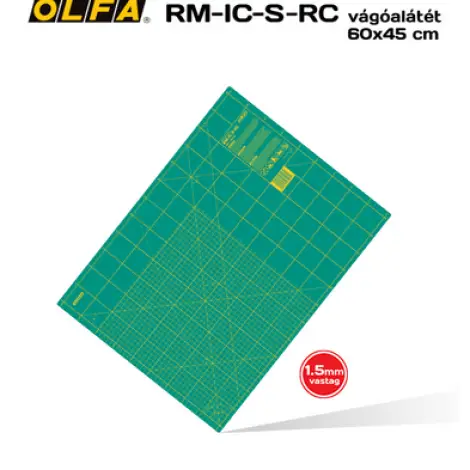 OLFA RM-IC-S - Vágóalátét. 60 x 45 cm-es, 1,5 mm vastagságú, speciális három rétegű "öngyógyuló" vágólap. A vágóalátét egyik oldala inch, másik oldala centiméter beosztású, valamint a leggyakrabban használt szögek is jelölve vannak. Csak körpengés foltvarró "patchwork" késekkel használható!